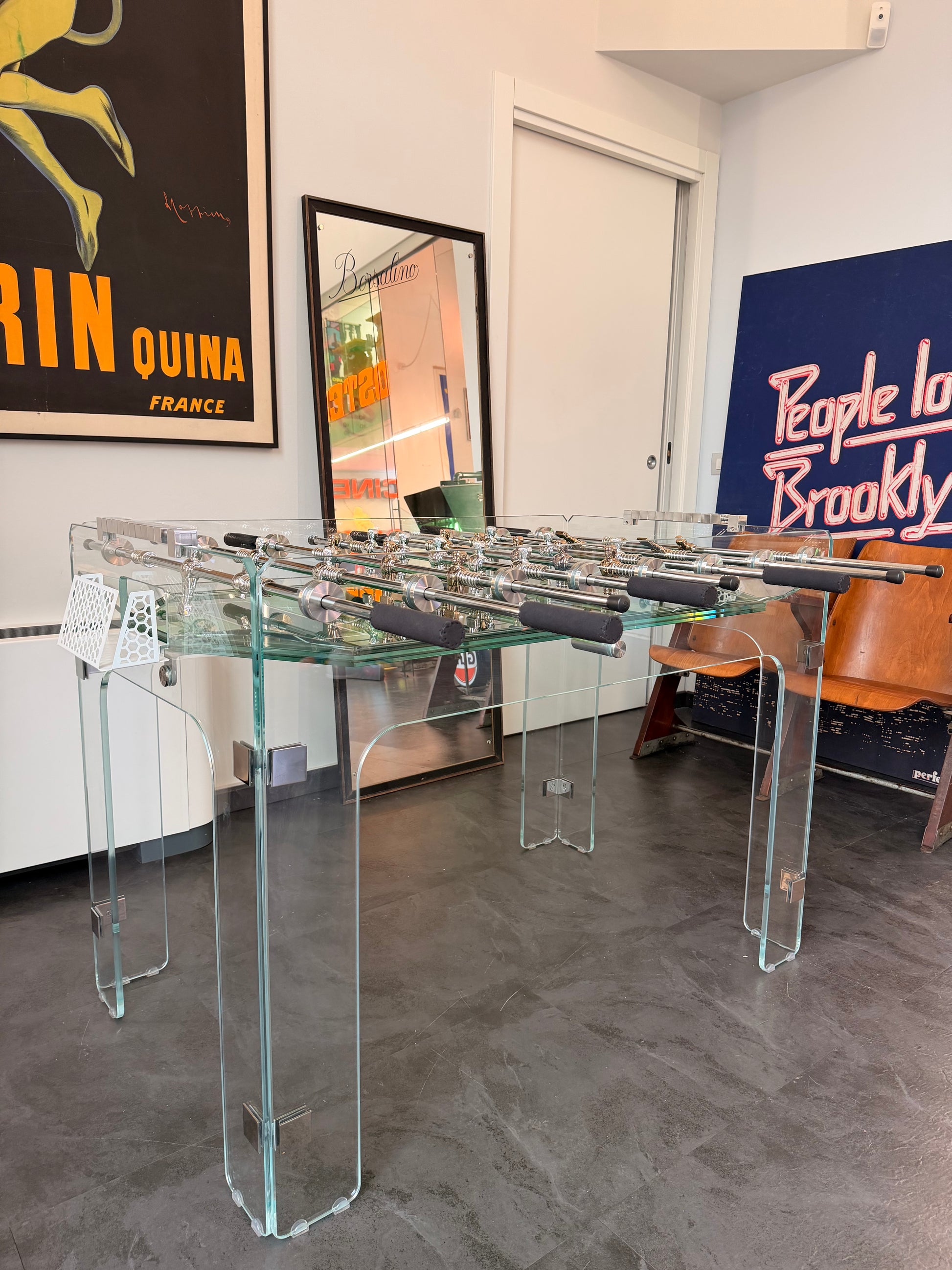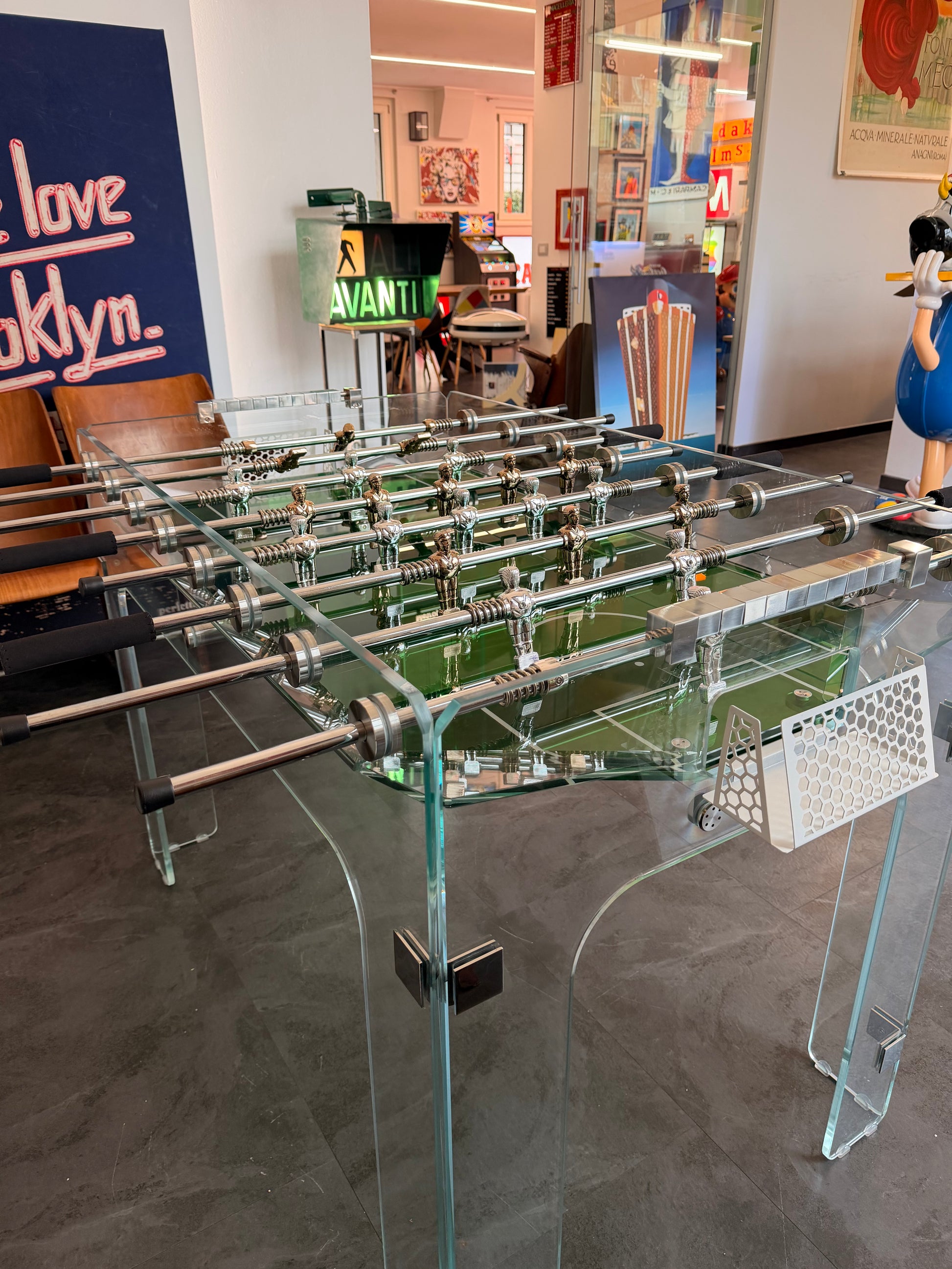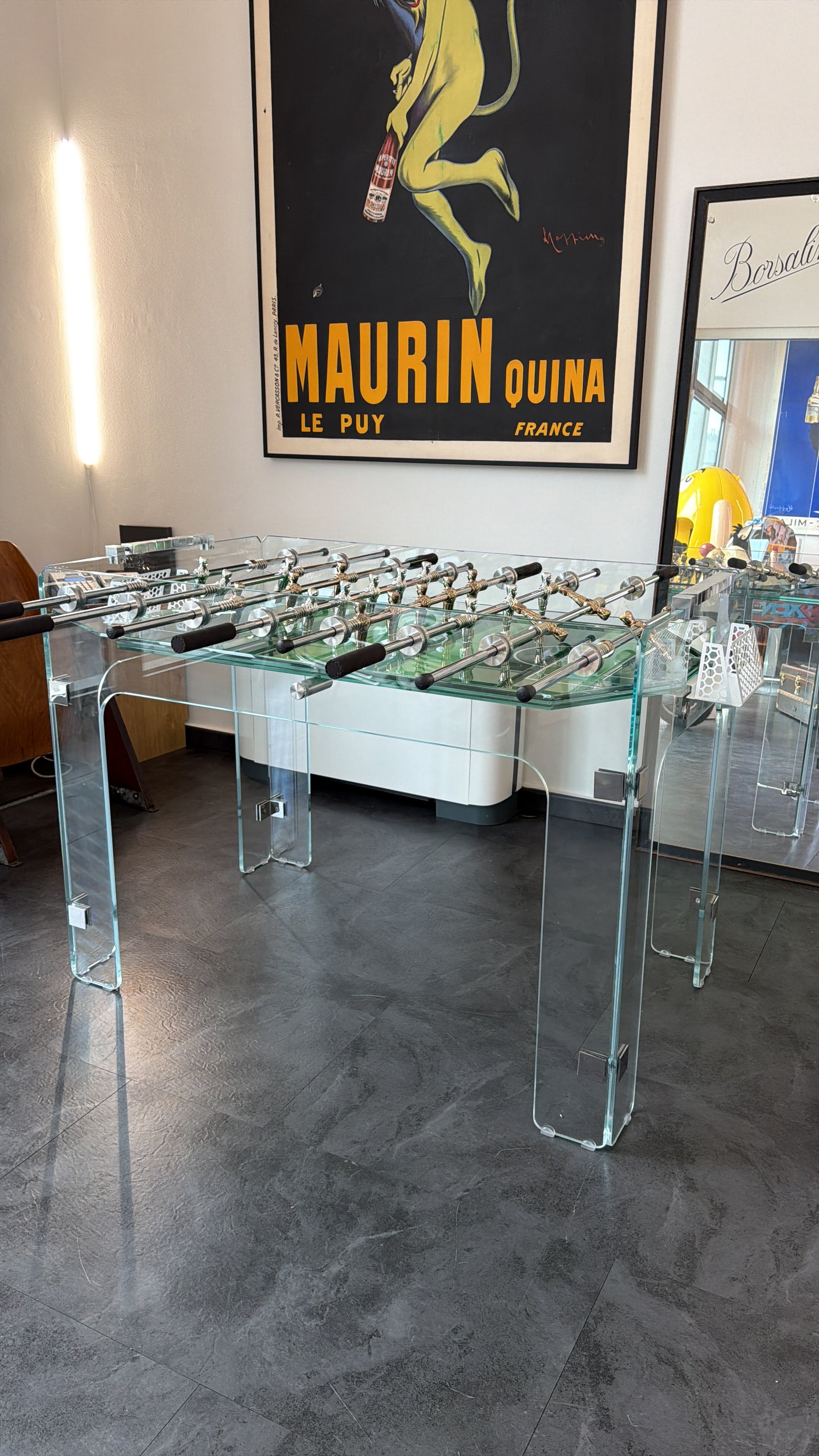 Condizioni: Vetro extra chiaro temperato spessore 18 mm Con struttura antinfortunistica. Ferramenta, giocatori e porte in acciaio inox. Compreso due kit di palline da gioco