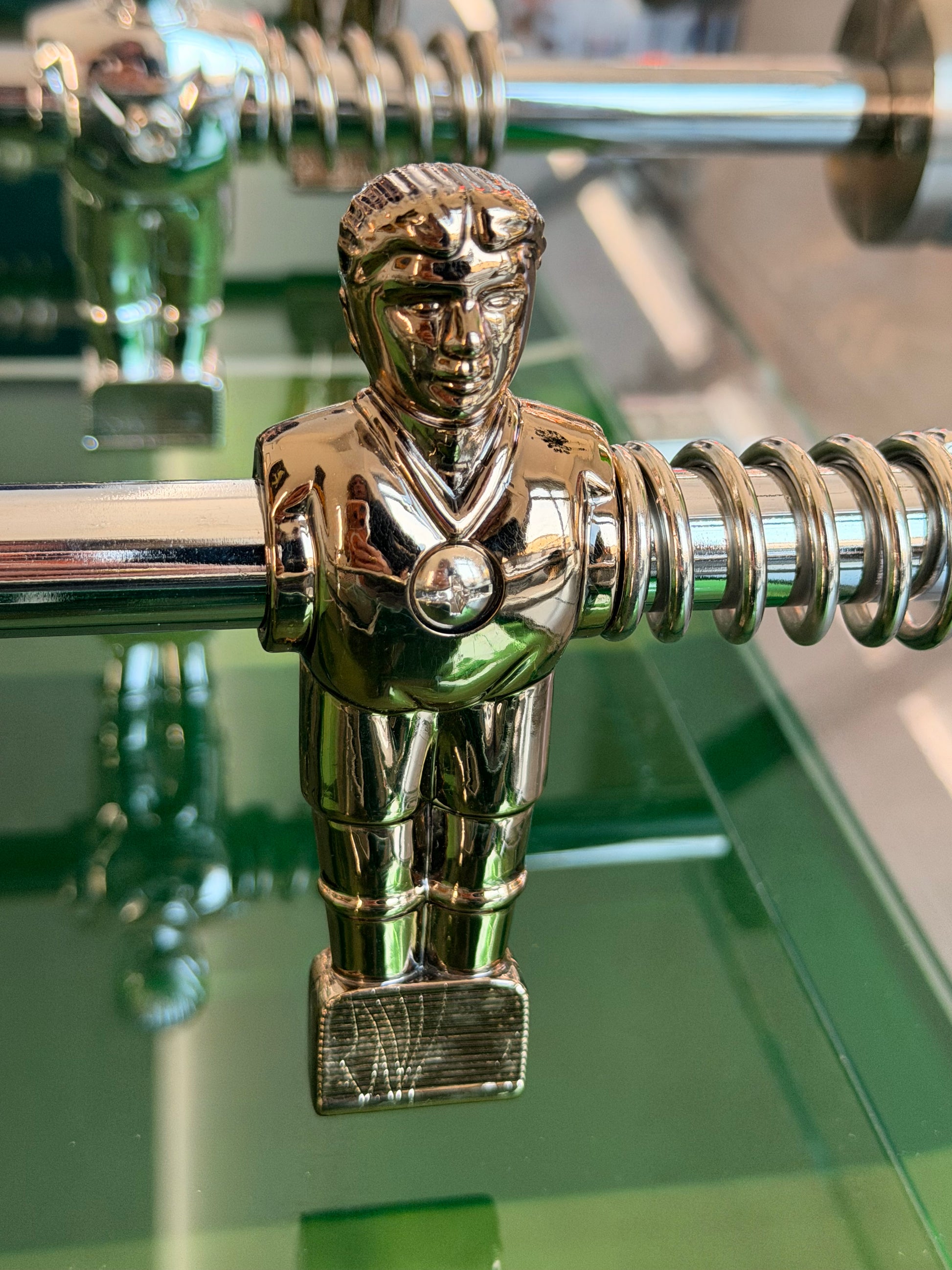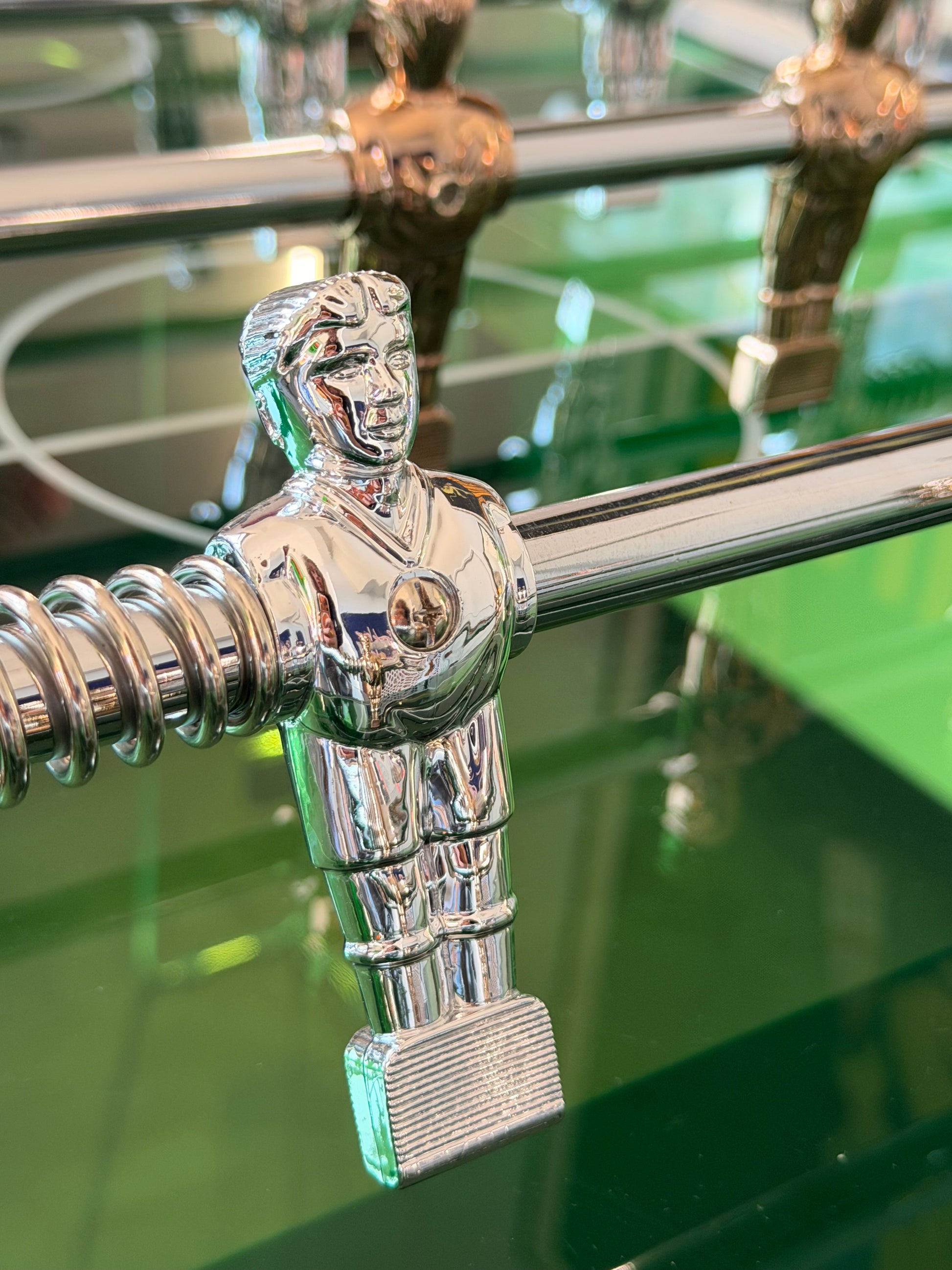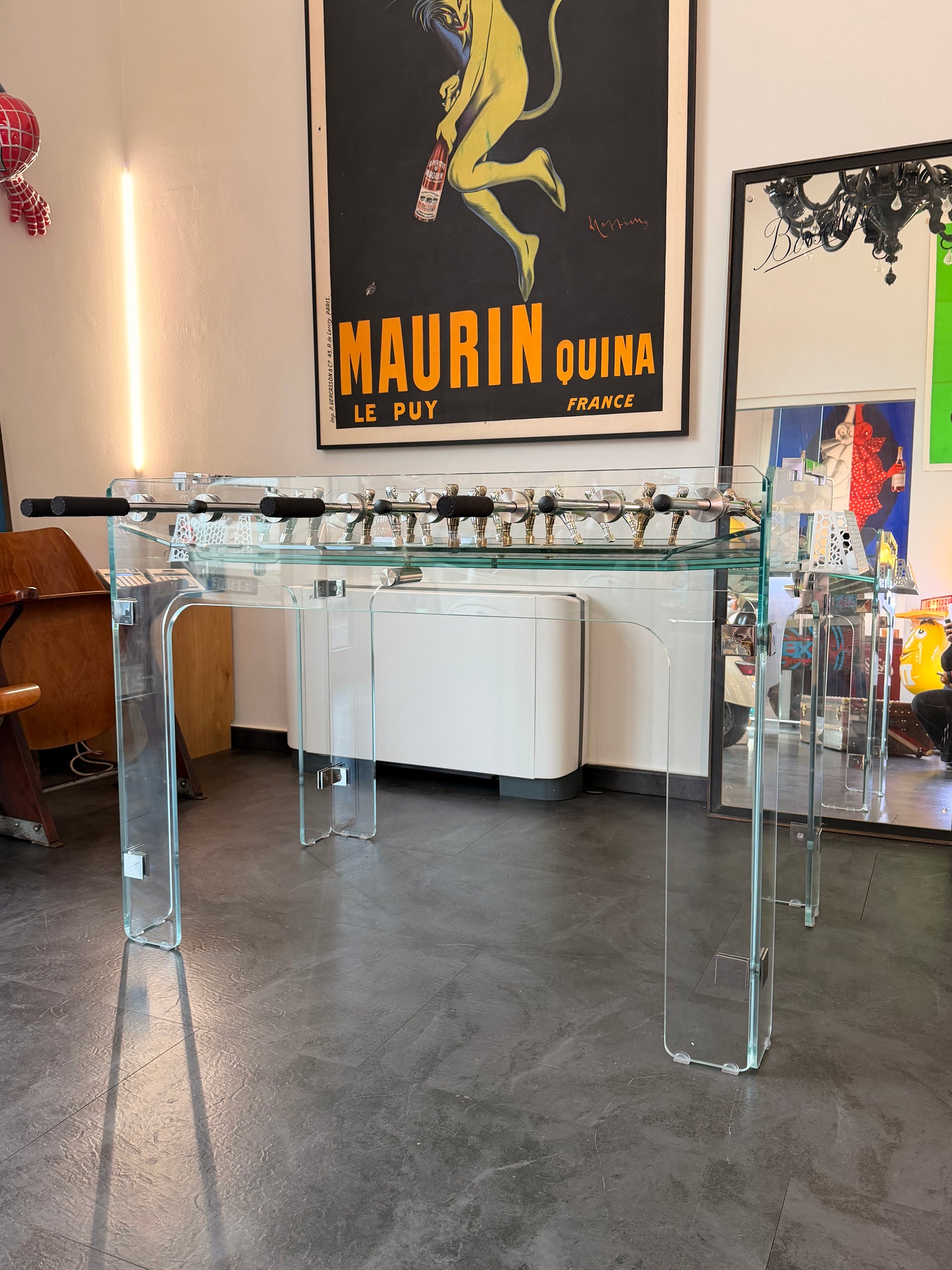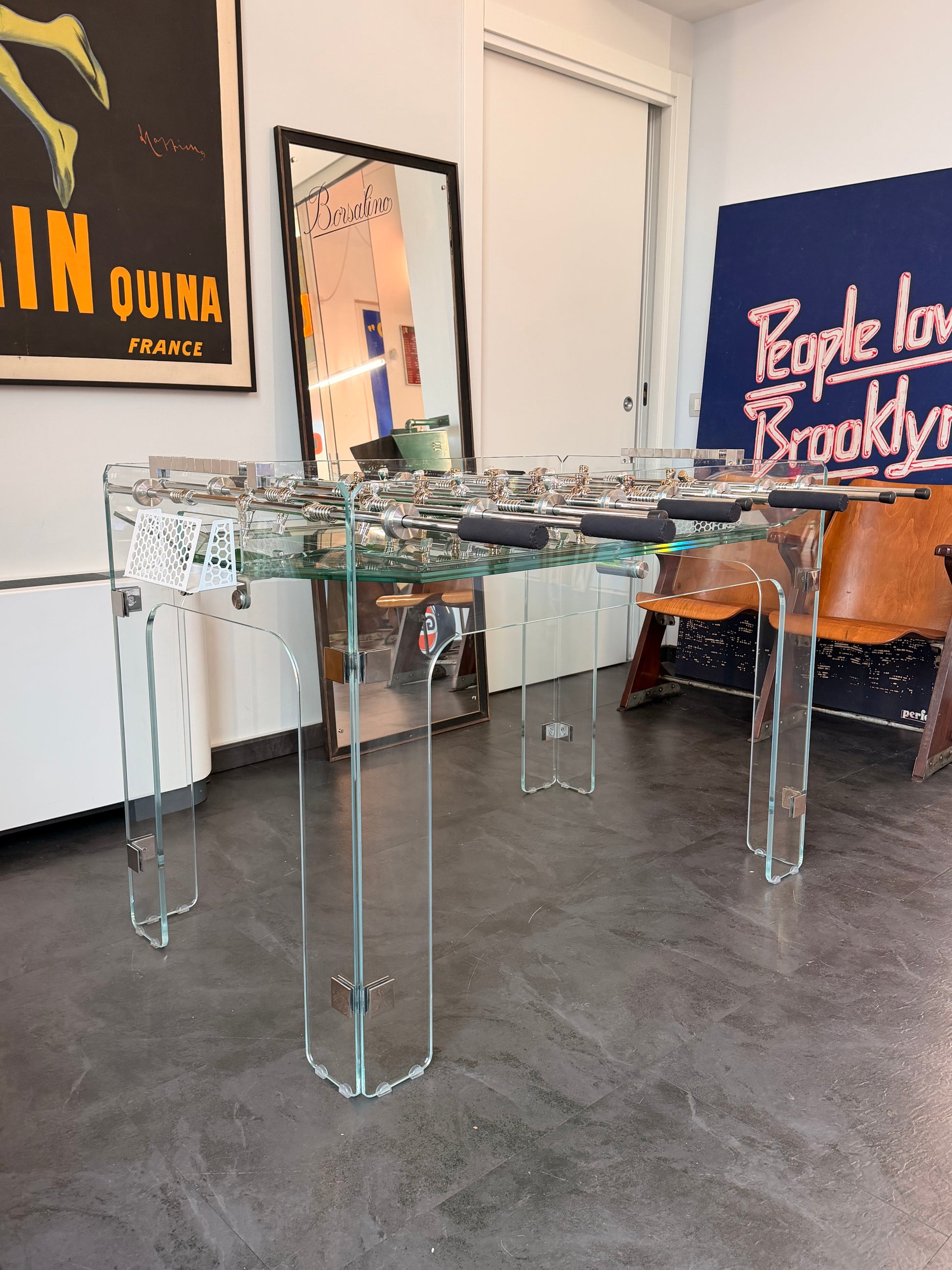 Condizioni: Vetro extra chiaro temperato spessore 18 mm Con struttura antinfortunistica. Ferramenta, giocatori e porte in acciaio inox. Compreso due kit di palline da gioco