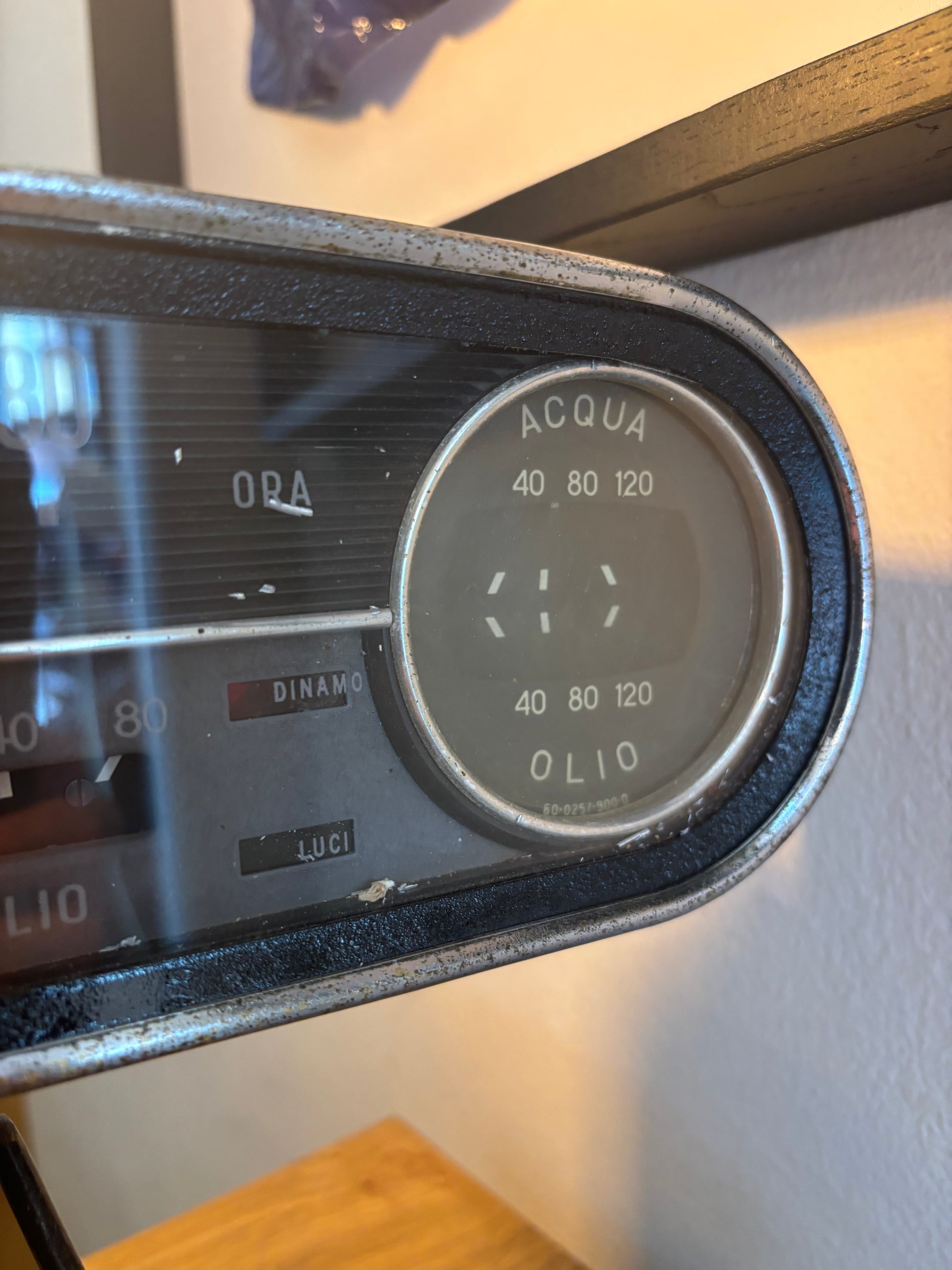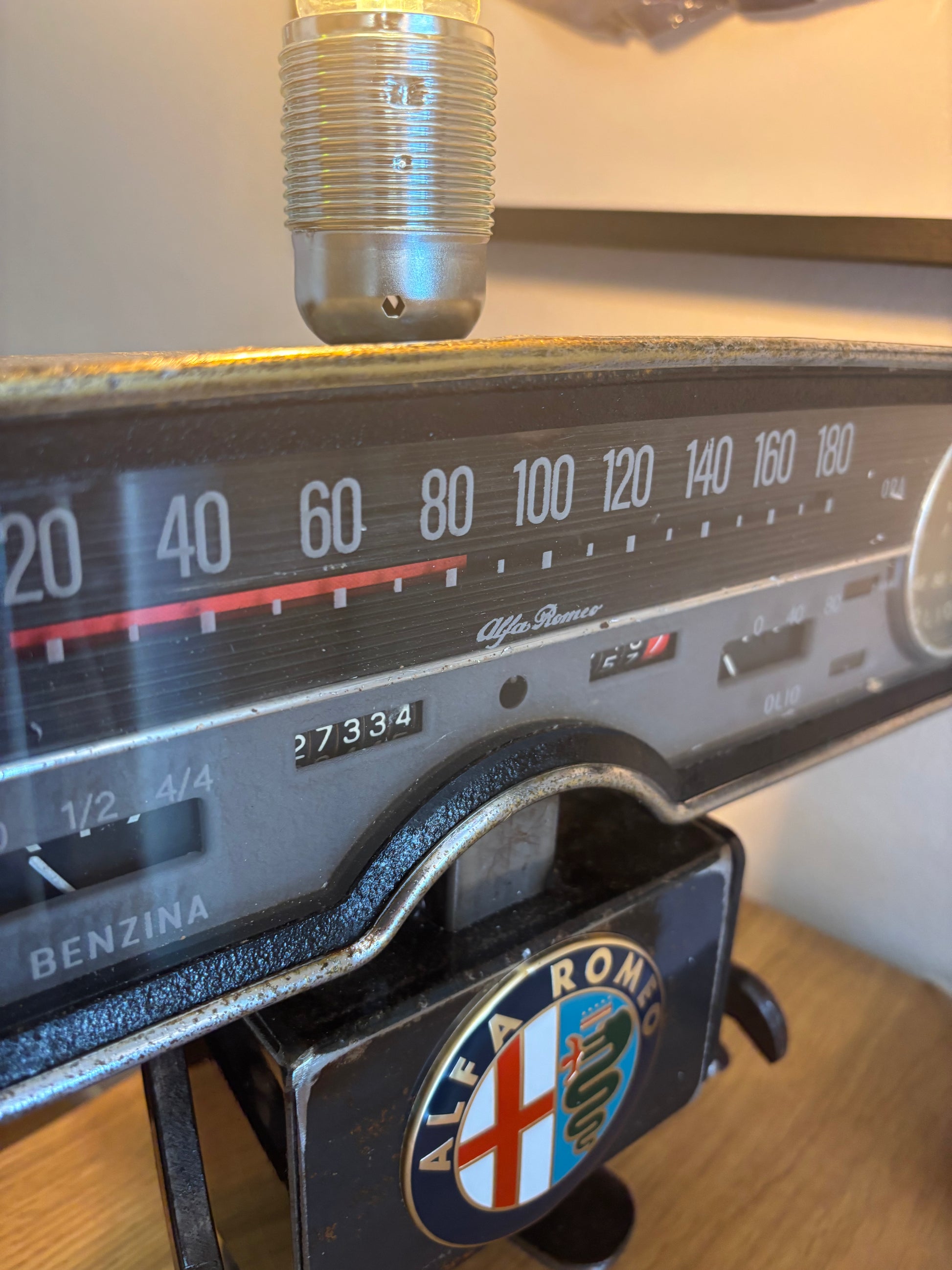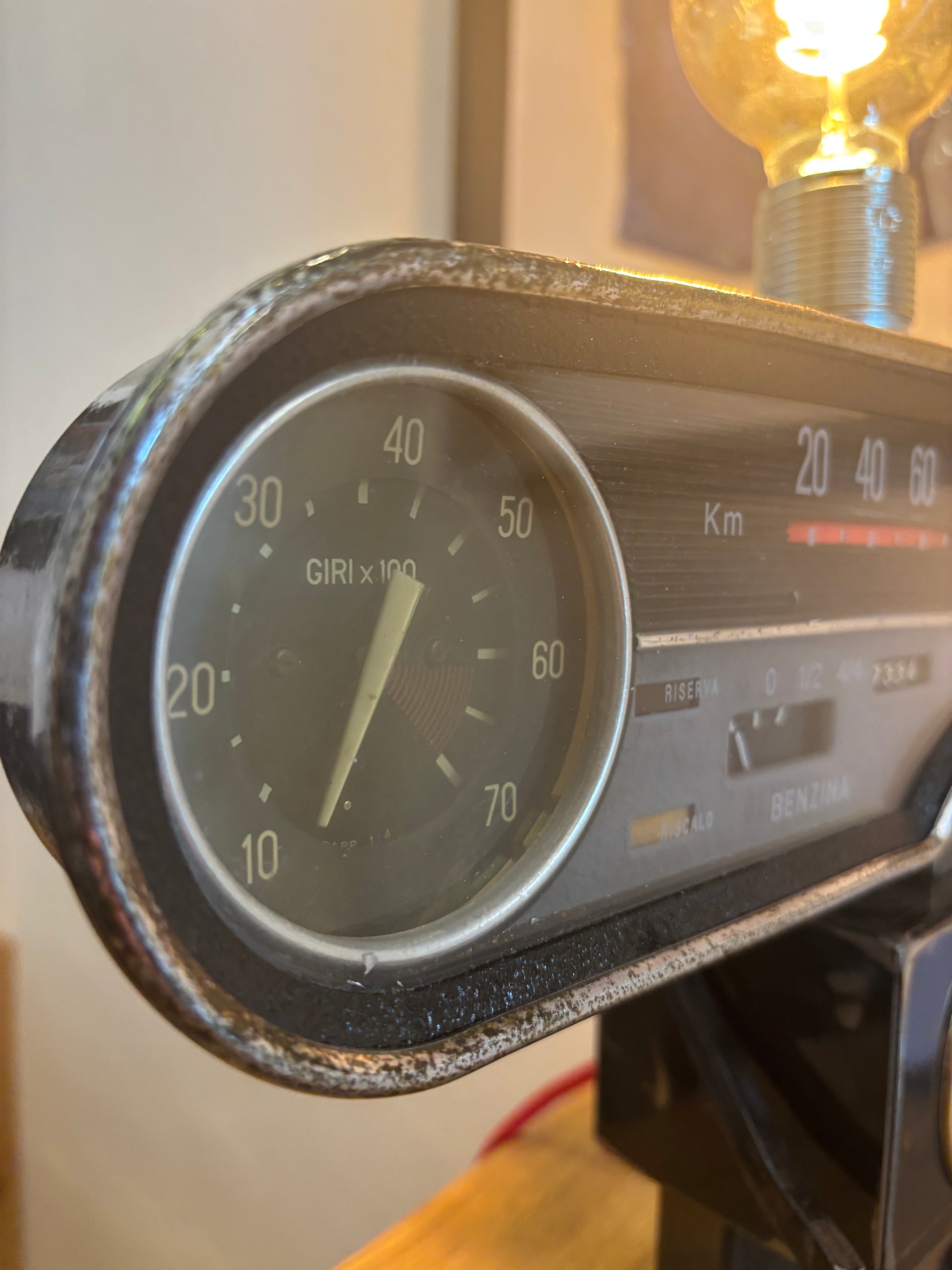 Descrizione : Lampada artigianale realizzata con componenti metallici riciclati in ferro e contachilometri Alfa Romeo originale anni 60. Ogni modello è un pezzo unico assemblato a mano.
