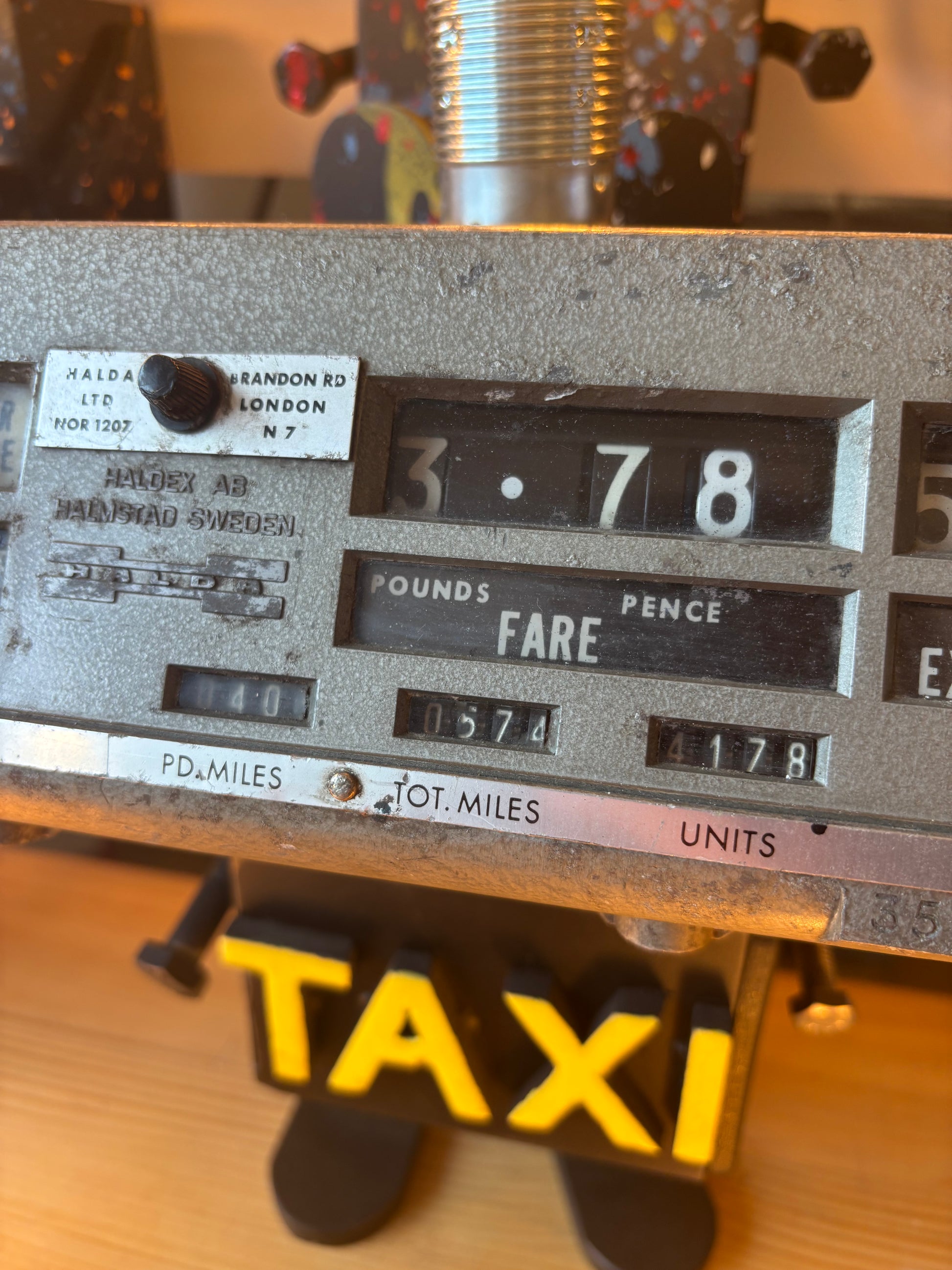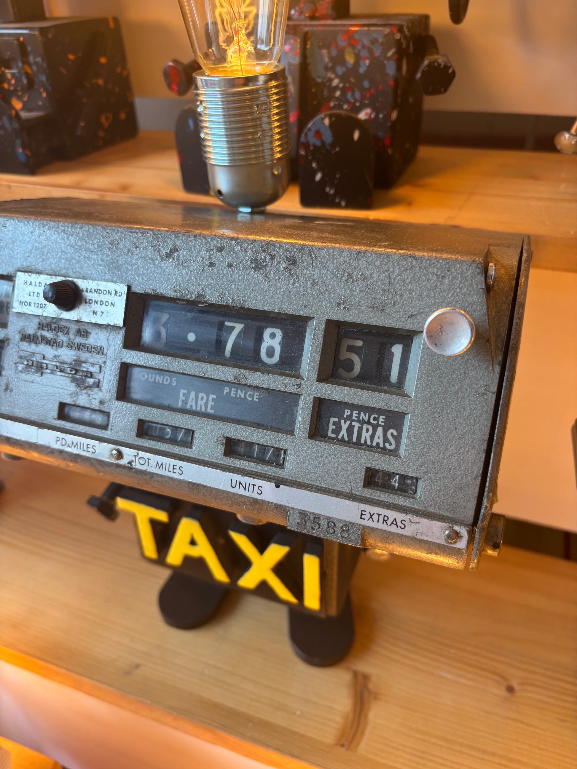 Descrizione : Lampada artigianale realizzata con componenti metallici riciclati in ferro e tassametro originale londinese anni 60. Ogni modello è un pezzo unico assemblato a mano.