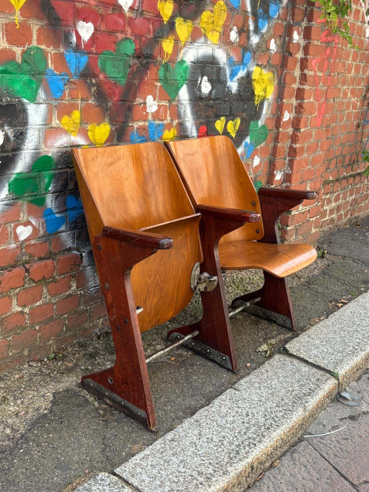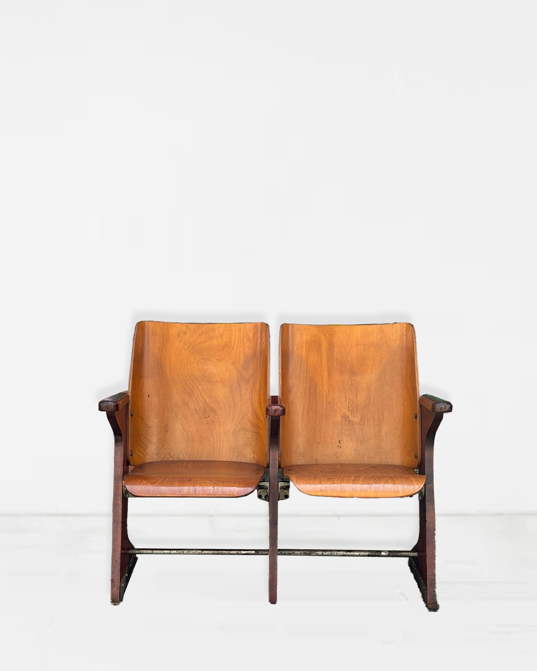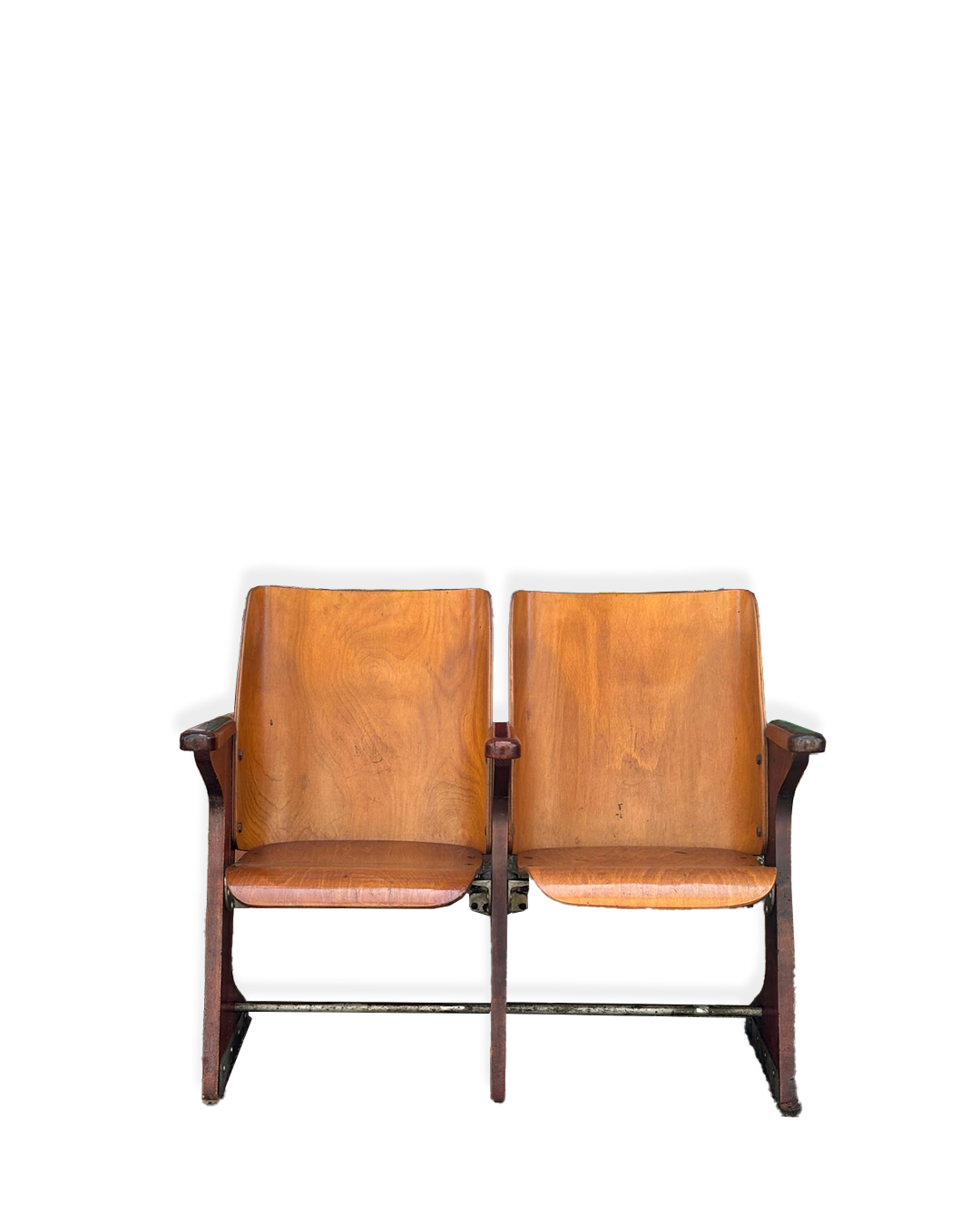 Descrizione : Sedie originali dei cinema anni 50 in legno massello di mogano su i lati con legno termo formato sulla seduta.