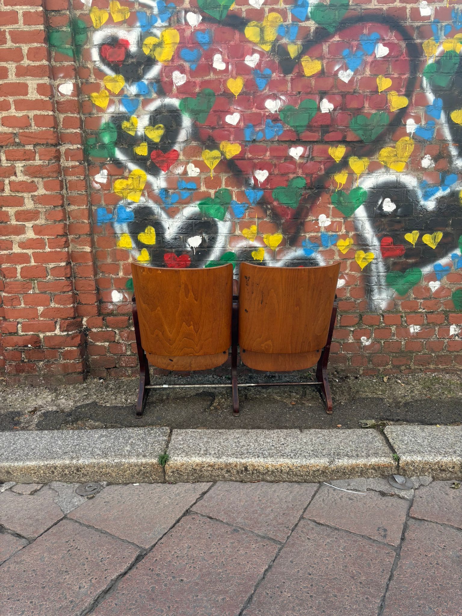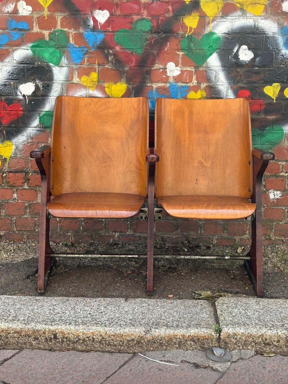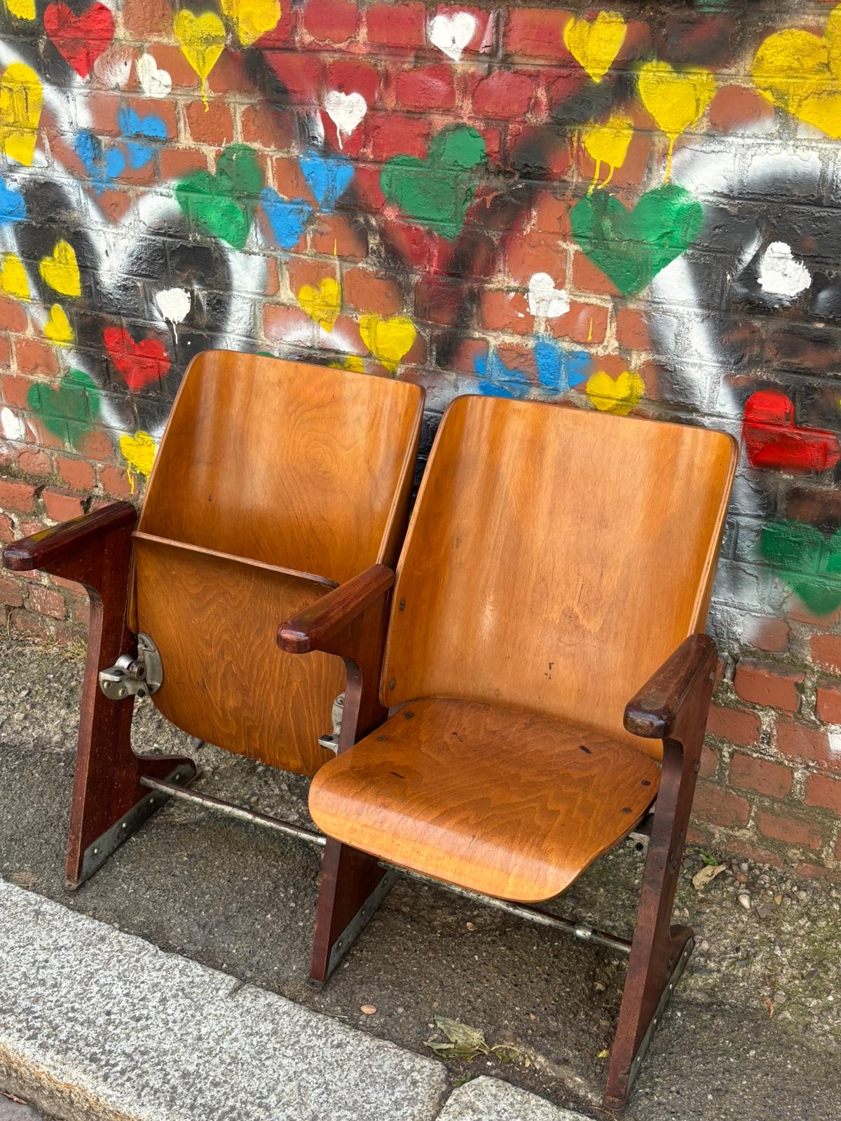 Descrizione : Sedie originali dei cinema anni 50 in legno massello di mogano su i lati con legno termo formato sulla seduta.