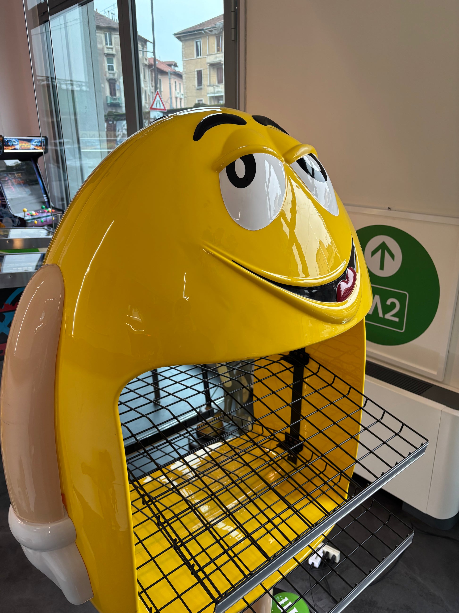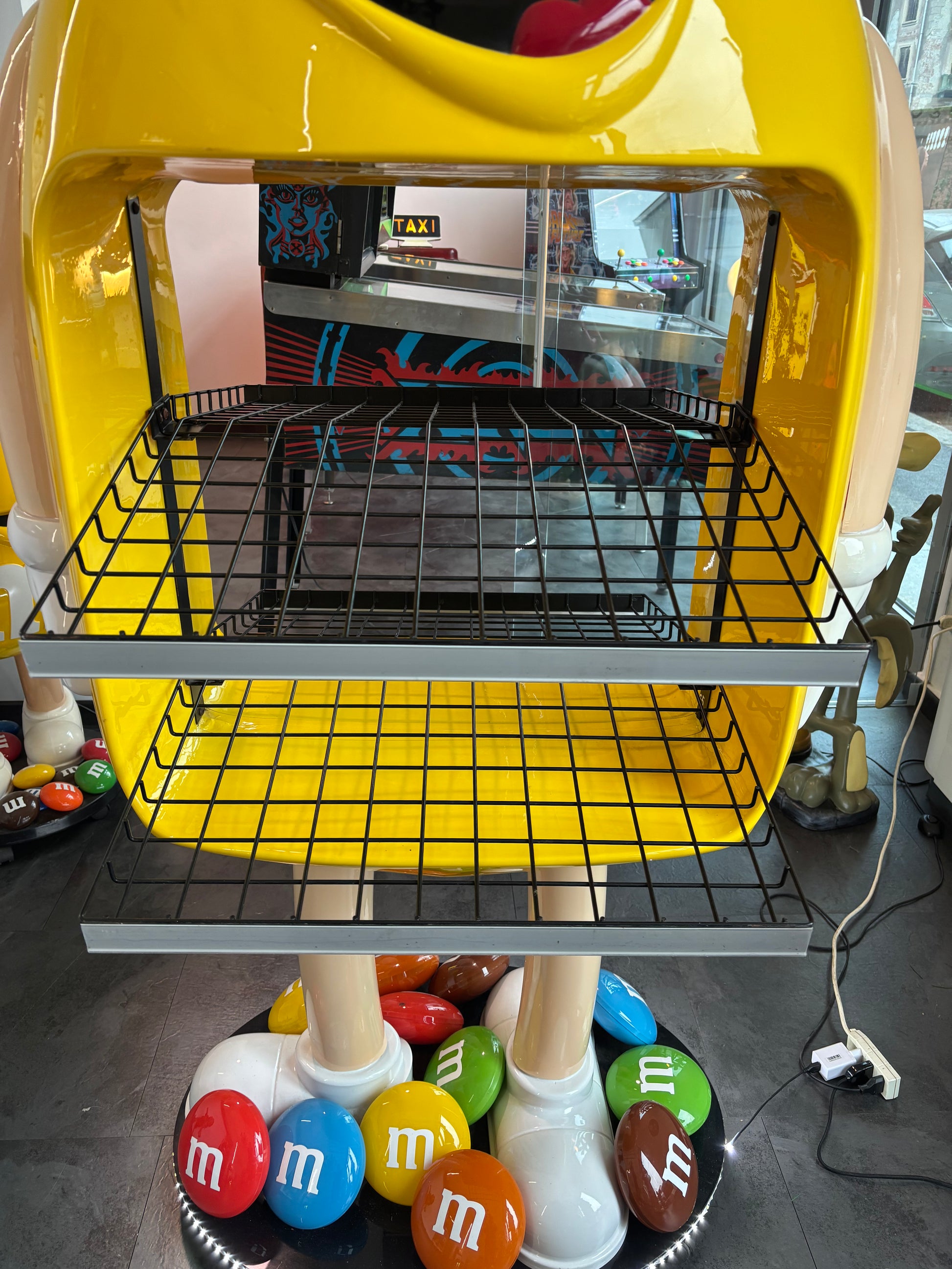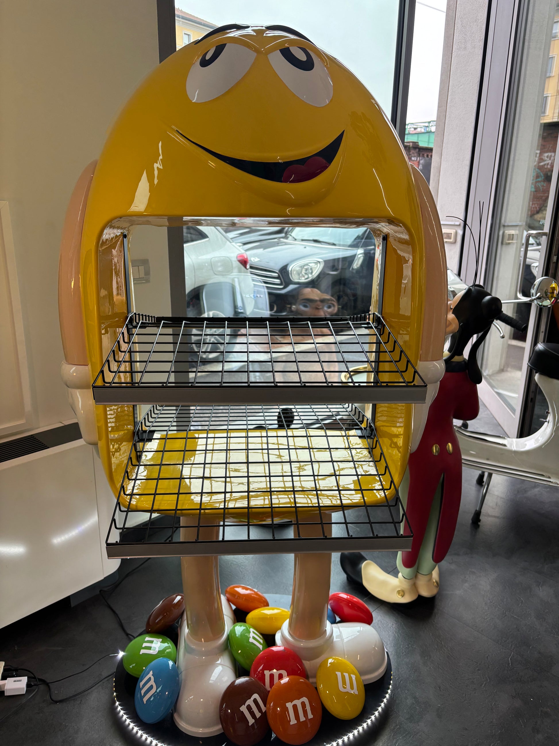 Descrizione : Statua decorativa originale M&Ms bifacciale con illuminazione led alla base e griglie porta oggetti.